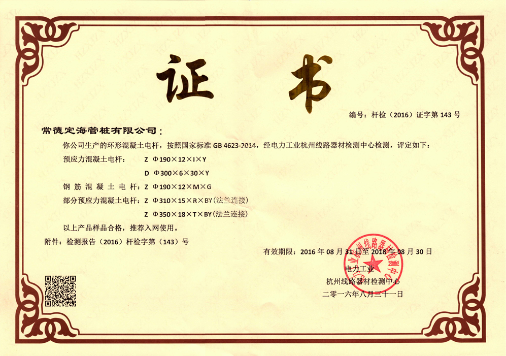 由本公司根據(jù)國標(biāo)GB4623-2014《環(huán)形混凝土電桿》研發(fā)生產(chǎn)并申請專利的系列預(yù)應(yīng)力混凝土等徑高壓電桿、系列部分預(yù)應(yīng)力混凝土大彎矩電桿、系列鋼筋混凝土電桿。經(jīng)國家電力線路器材檢測機(jī)構(gòu)具備簽發(fā)入網(wǎng)許可證書的單位,電力工業(yè)杭州線路器材檢測中心實(shí)地抽樣檢測,各項(xiàng)檢測指標(biāo)均優(yōu)于國家標(biāo)準(zhǔn),簽發(fā)了桿檢(2016)證字第143號推薦入網(wǎng)使用證書。為公司的產(chǎn)業(yè)鏈延伸以及電桿項(xiàng)目投標(biāo)提供了有力的技術(shù)支撐。